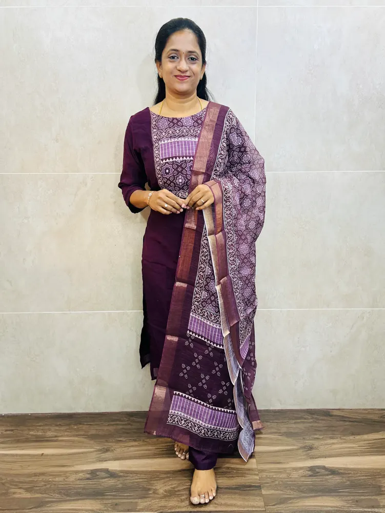 (Majenta purple)Soft linen cotton top(full crepe lining) with printed patchwork on yoke paired with printed linen cotton dupatta and silk bottom(straight cut)
