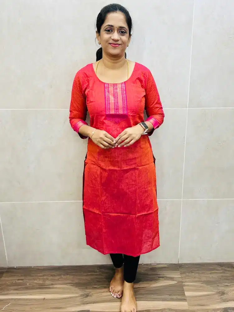 (Orange)Mangalgiri cotton top with patchwork on yoke and sleeves(straight cut)