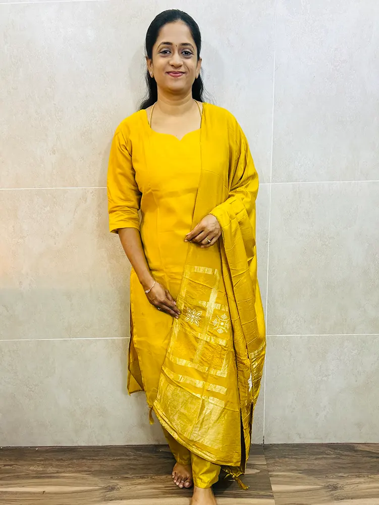 Muslin silk top (cotton lining) paired with thread weaved muslin silk dupatta and silk Bottom (free size)