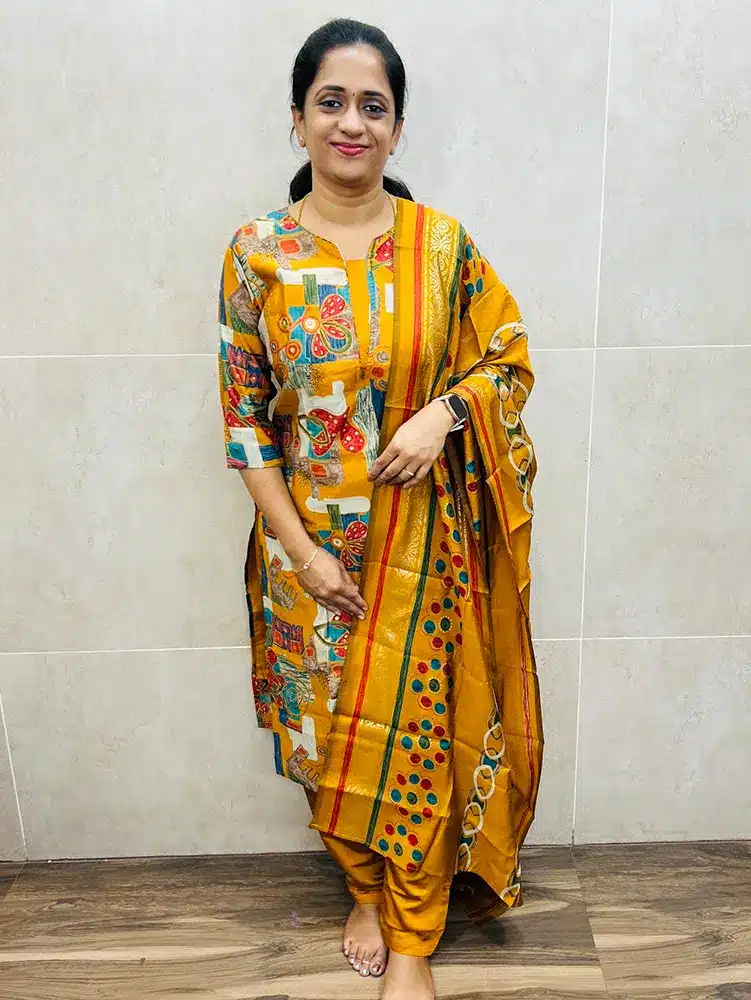 Printed premium muslin silk top (cotton lining) paired with printed muslin silk dupatta and silk bottom (straight cut)
