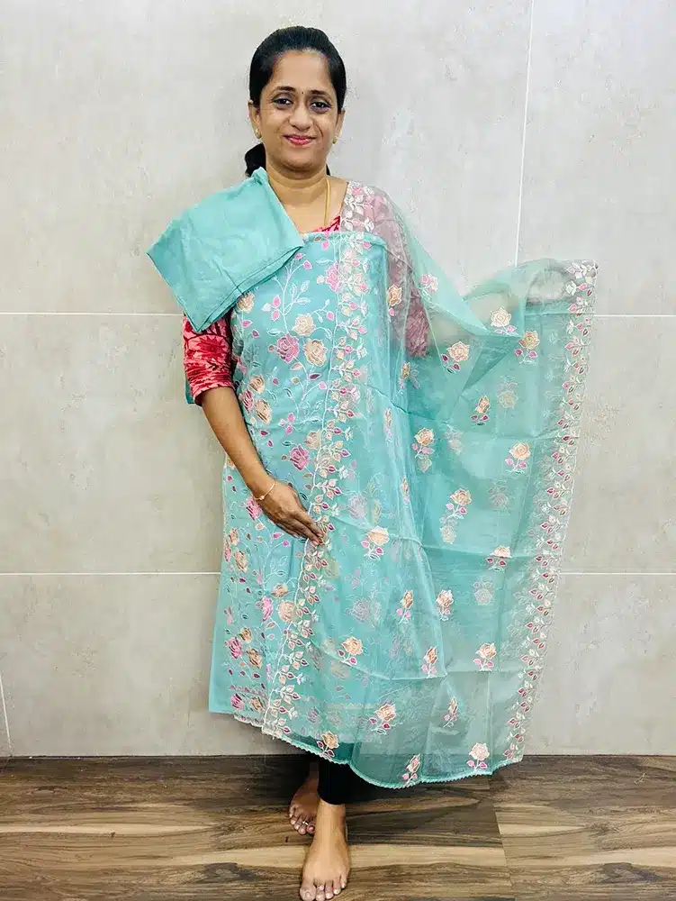 Most of our cotton salwar suits, measurement of the top will be 2.5 meters, dupatta will be from 2.2 to 2.5 meters and bottom will be 2 meters. If you have measurement constraint, please check with us through whatsapp (9176641794) prior booking.