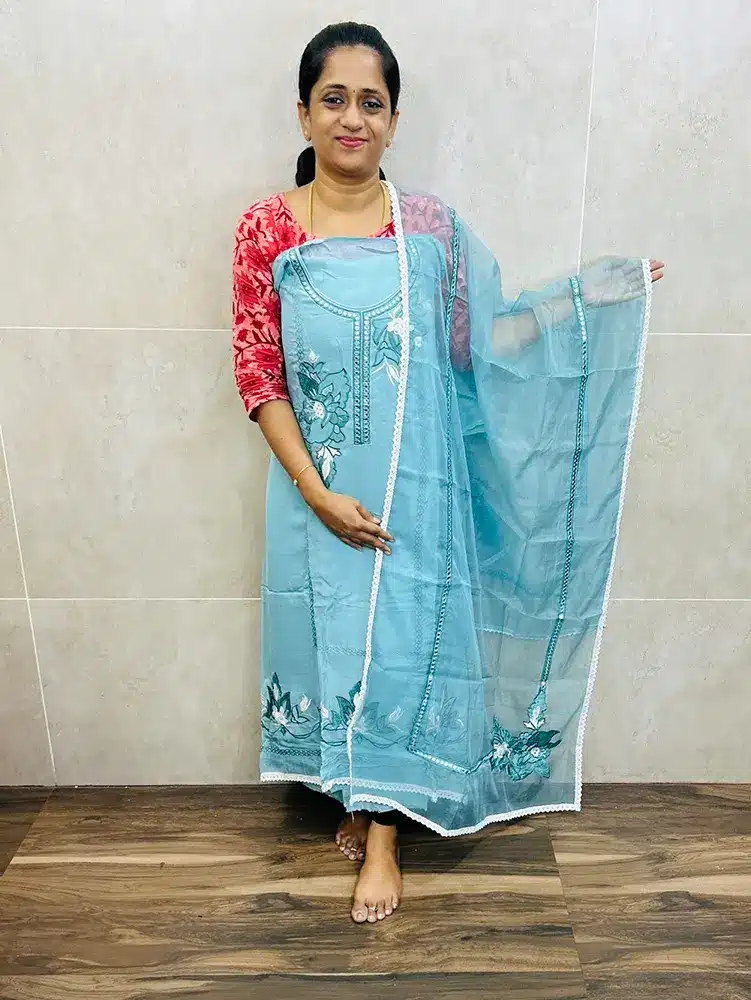 Most of our cotton salwar suits, measurement of the top will be 2.5 meters, dupatta will be from 2.2 to 2.5 meters and bottom will be 2 meters. If you have measurement constraint, please check with us through whatsapp (9176641794) prior booking.