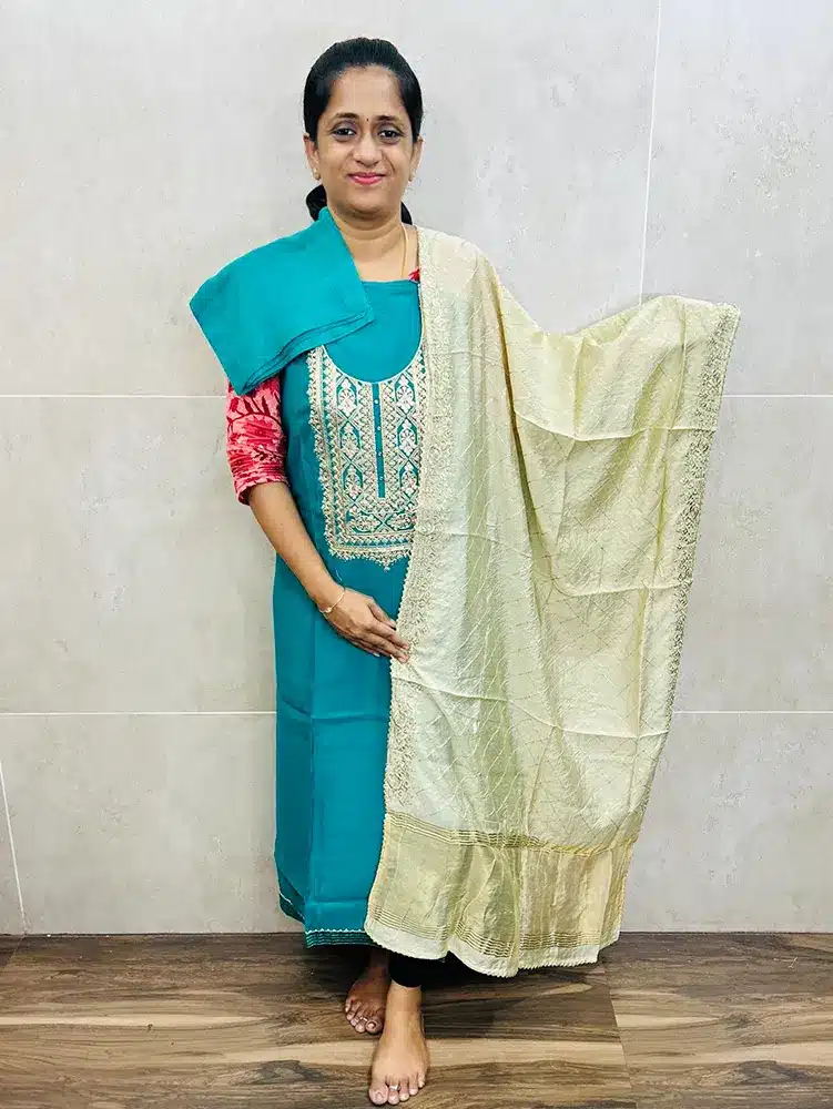 Most of our cotton salwar suits, measurement of the top will be 2.5 meters, dupatta will be from 2.2 to 2.5 meters and bottom will be 2 meters. If you have measurement constraint, please check with us through whatsapp (9176641794) prior booking.