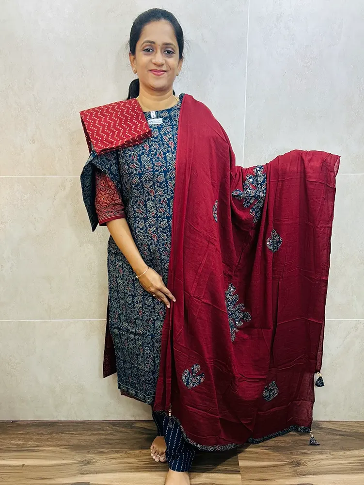 Pattern 2 – Original Ajrakh dyed cotton top (cotton lining) paired with patch worked cotton dupatta and cotton bottom (free size)