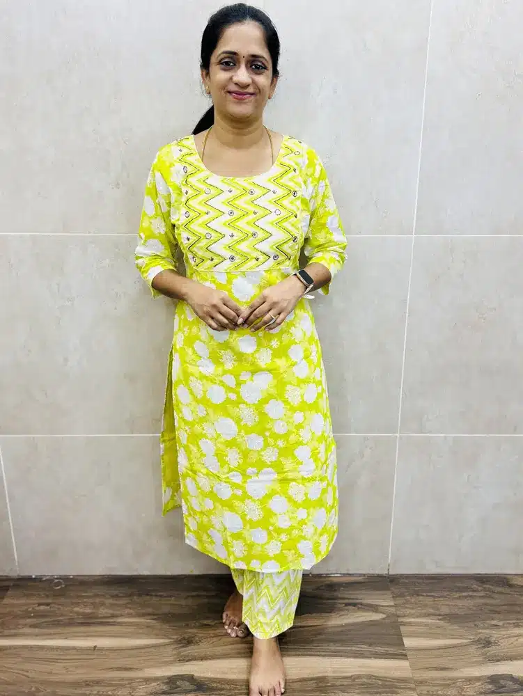 (Yellowish Neon green)Premium cotton top(cotton lining)with handworked yoke paired with printed cotton bottom(straight cut)