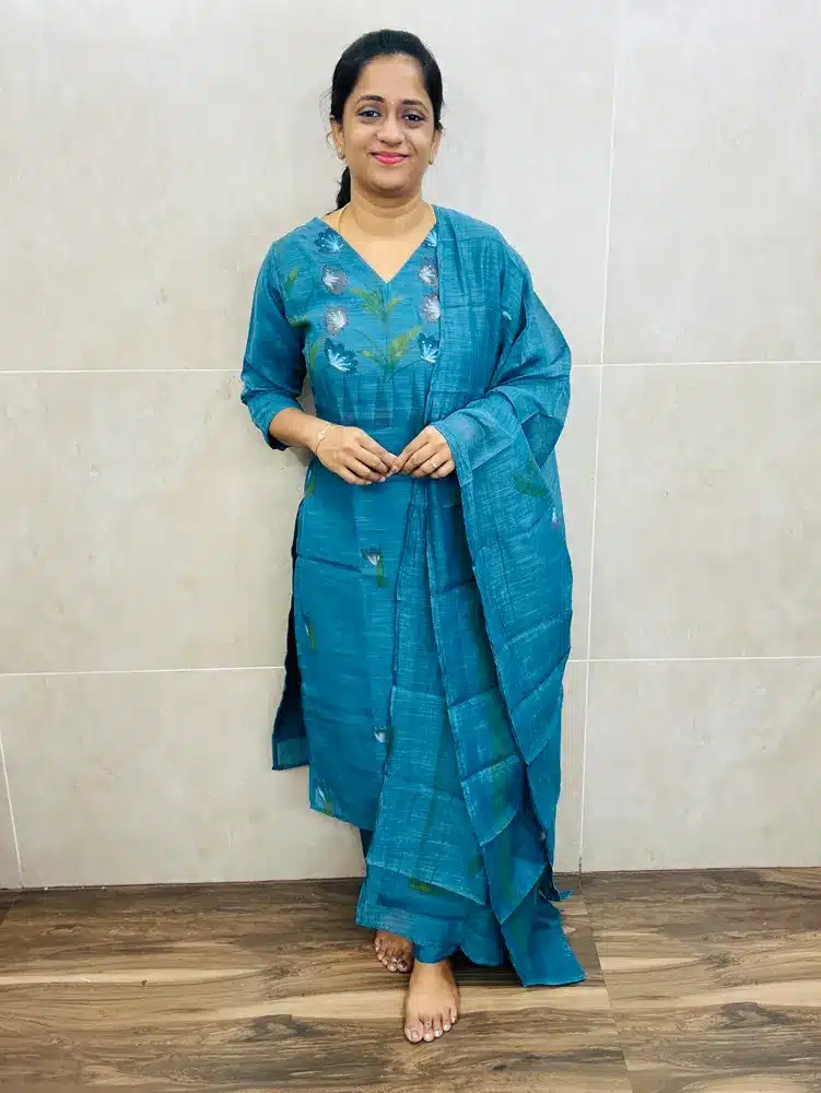 Teal Blue – Premium linen cotton top(crepe lining) with brush paint pattern paired with linen cotton dupatta and silk bottom(straight cut)