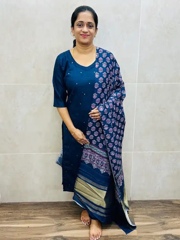 Premium linen cotton top(crepe lining)with all over mirror work paired with mirror worked Ajrakh printed soft silk dupatta and silk bottom(straight cut)