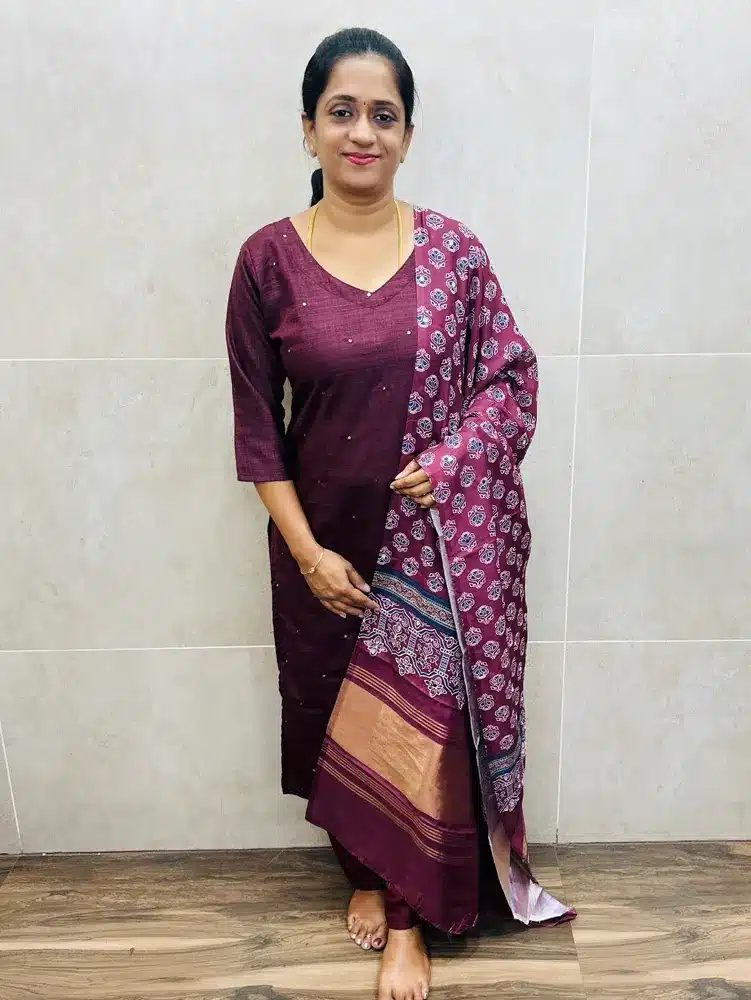 Premium linen cotton top(crepe lining)with all over mirror work paired with mirror worked Ajrakh printed soft silk dupatta and silk bottom(straight cut)