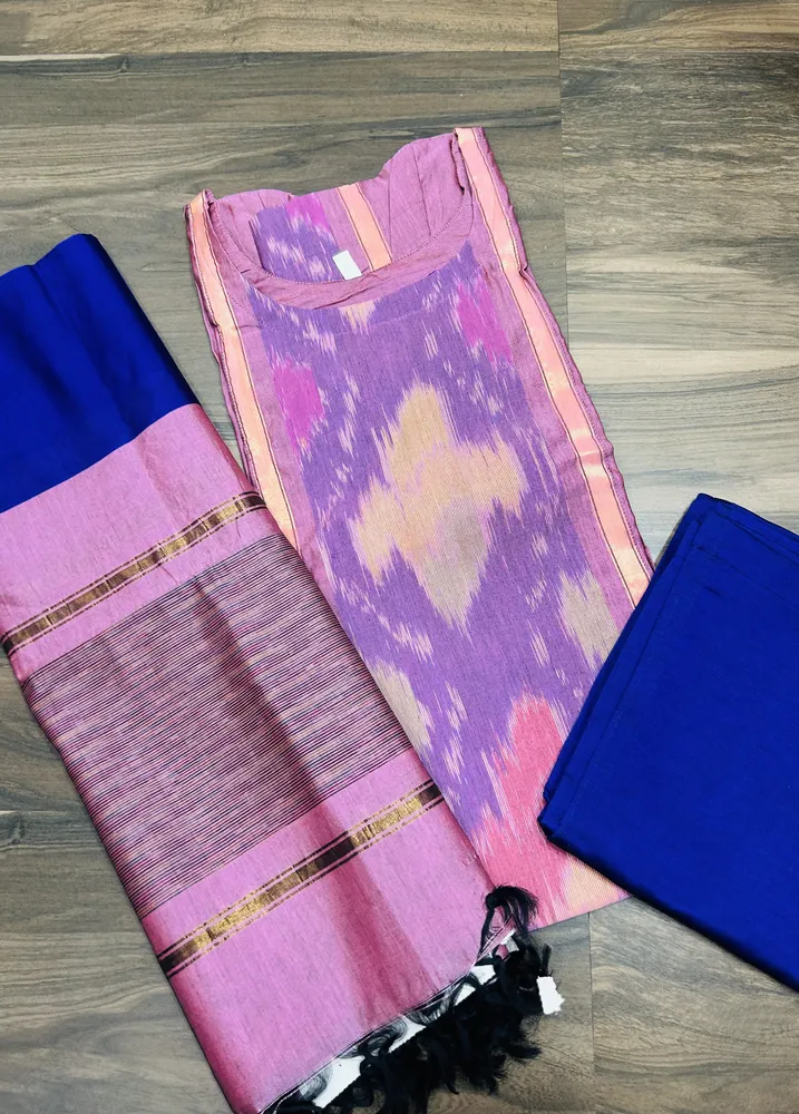 Premium Pochampally handloom silk cotton top (cotton lining) paired with silk cotton dupatta and silk bottom (Free size)