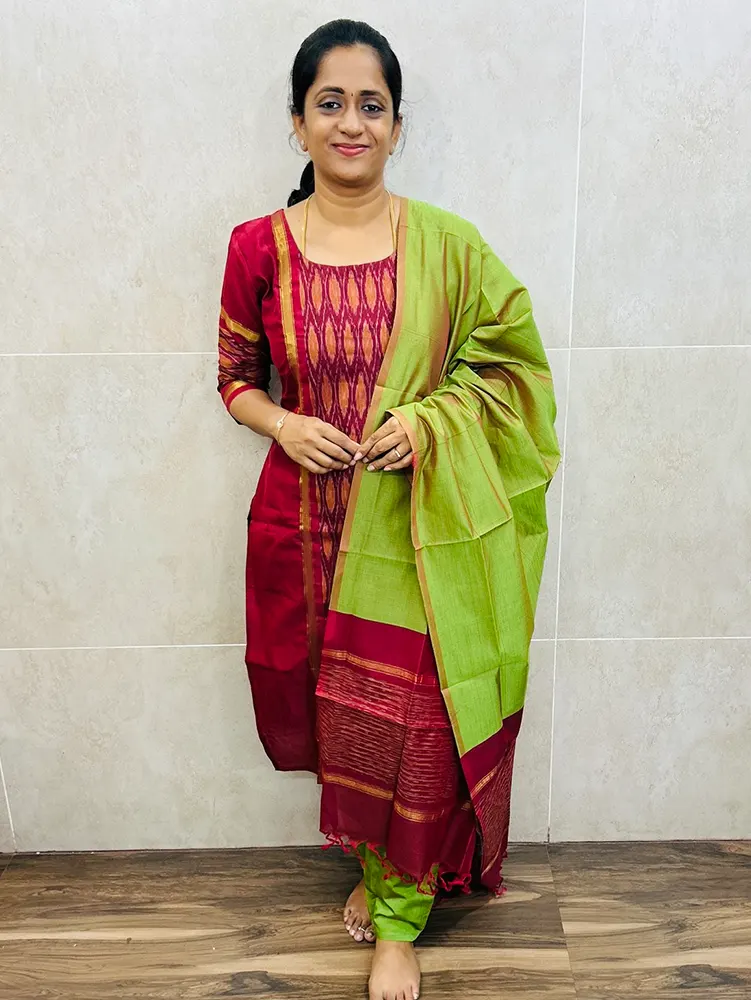 Premium Pochampally handloom silk cotton top (cotton lining) paired with silk cotton dupatta and silk bottom (Free size)