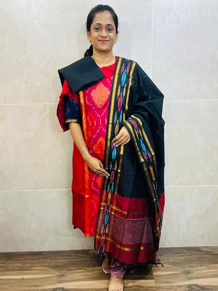 Premium Pochampally handloom silk cotton top (cotton lining) paired with silk cotton dupatta and silk bottom (Free size)