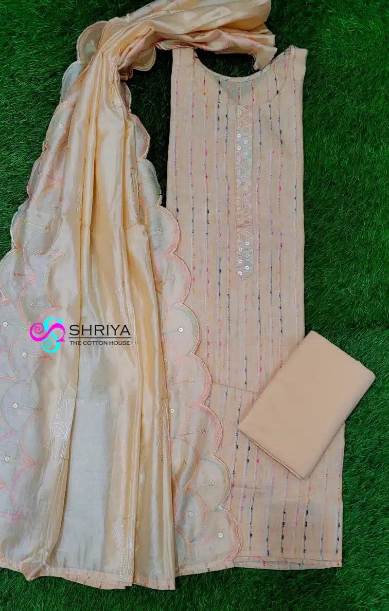 Premium quality pure linen top with allover woven patterns paired with a printed soft chiffon dupatta and cotton bottom