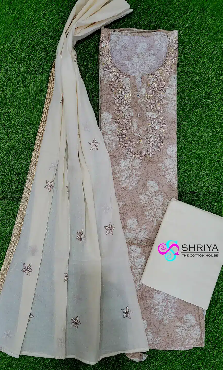 Most of our cotton salwar suits, measurement of the top will be 2.5 meters, dupatta will be from 2.2 to 2.5 meters and bottom will be 2 meters. If you have measurement constraint, please check with us through whatsapp (9176641794) prior booking.