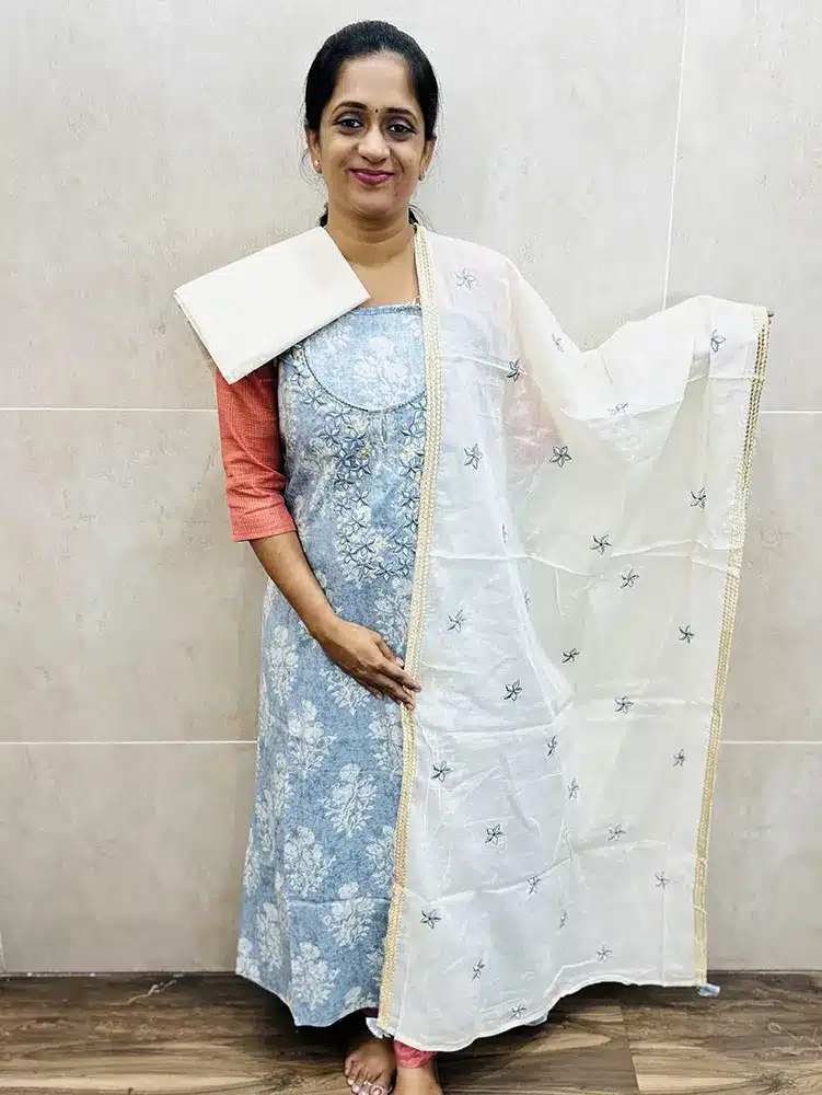 Most of our cotton salwar suits, measurement of the top will be 2.5 meters, dupatta will be from 2.2 to 2.5 meters and bottom will be 2 meters. If you have measurement constraint, please check with us through whatsapp (9176641794) prior booking.