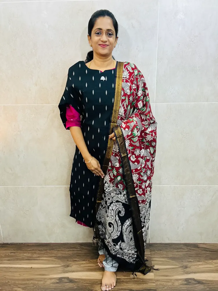Premium semi raw silk top(cotton lining) paired with chennuri silk kalamkari dupatta and semi raw silk bottom(free size)