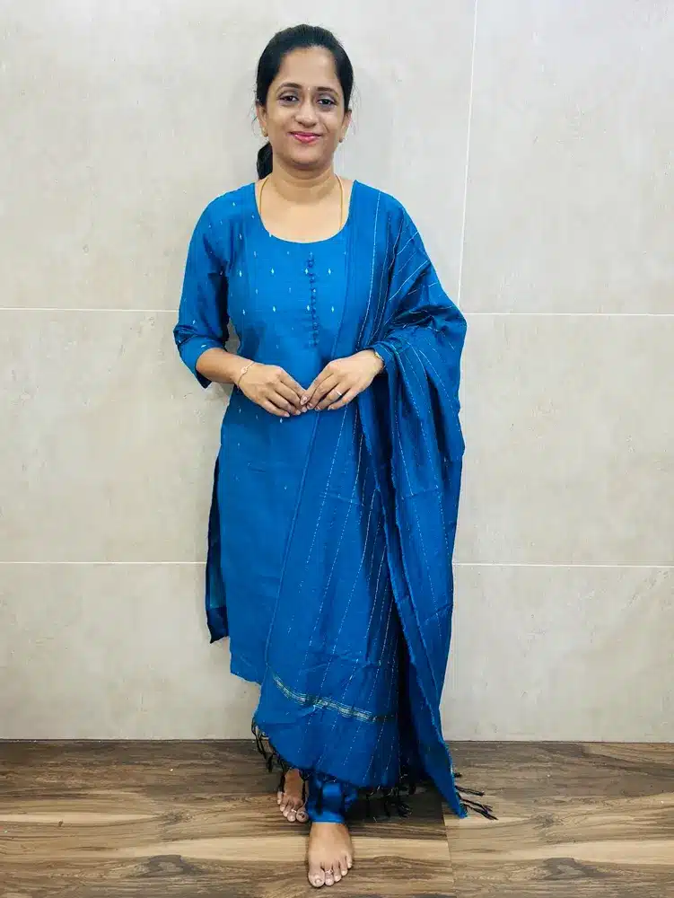 (Anandha blue)Premium semi raw silk top (cotton lining) with all over zari buttas paired with semi raw silk dupatta and silk cotton bottom(free size)