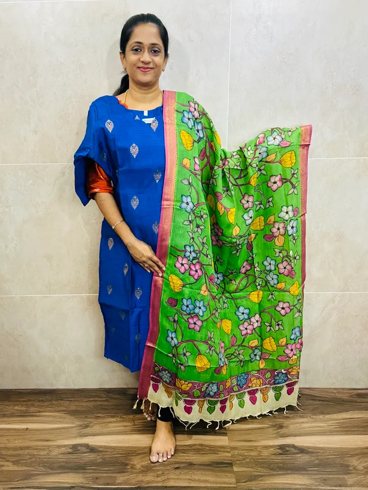 Premium semi raw silk top(cotton lining) with allover zari weaving buttas paired with handpainted kalamkari silk duppata