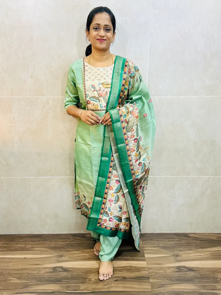 Premium semi tussar silk top(cotton lining) paired with tussar silk dupatta and santoon bottom(free size)