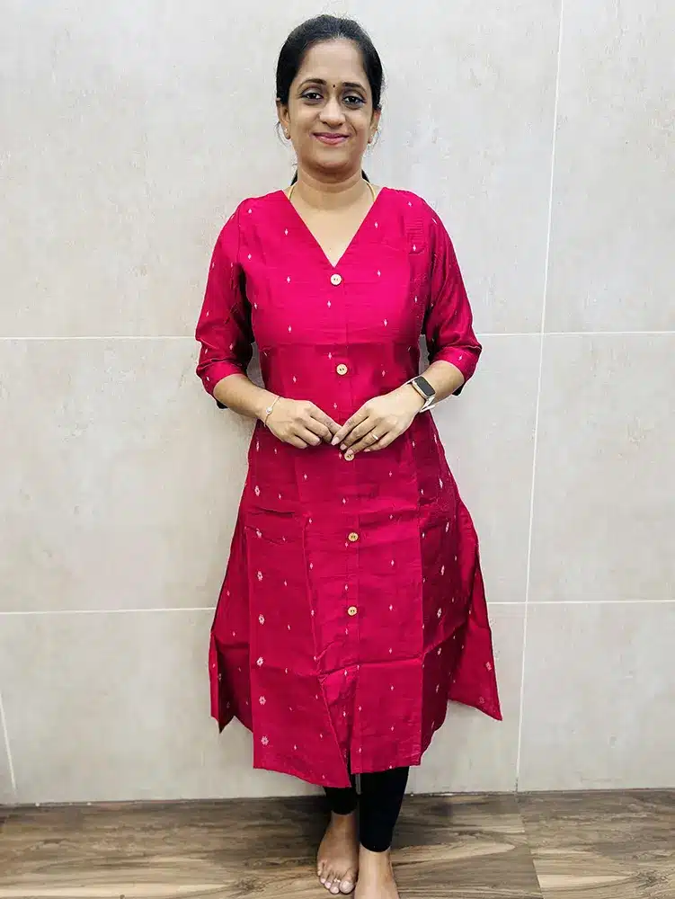 Rani pink – Premium silk cotton top (cotton lining) with allover zari woven buttas and fancy buttons on yoke-2side pockets (Aline pattern)