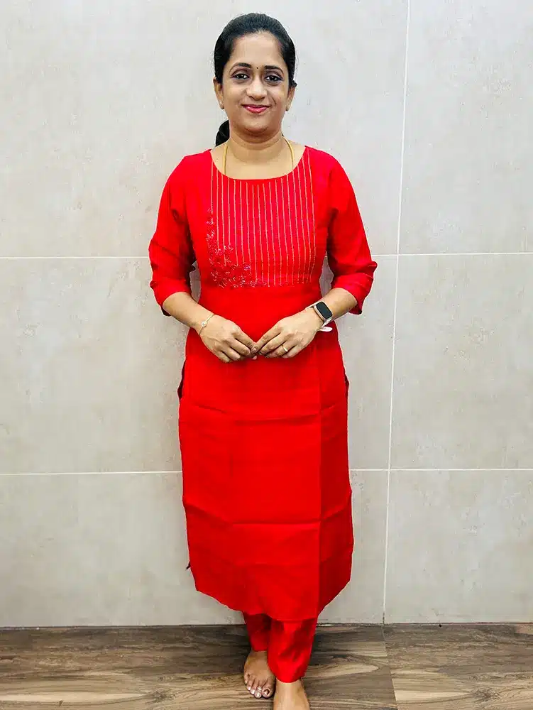 Red – Premium silk cotton top (crepe lining) with allover jacquard weaving and handworked yoke paired with soft silk bottom (straight cut)