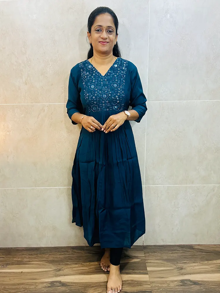 Premium soft silk top (cotton lining) with embroidered hand worked yoke with pleated flare (Aline pattern)