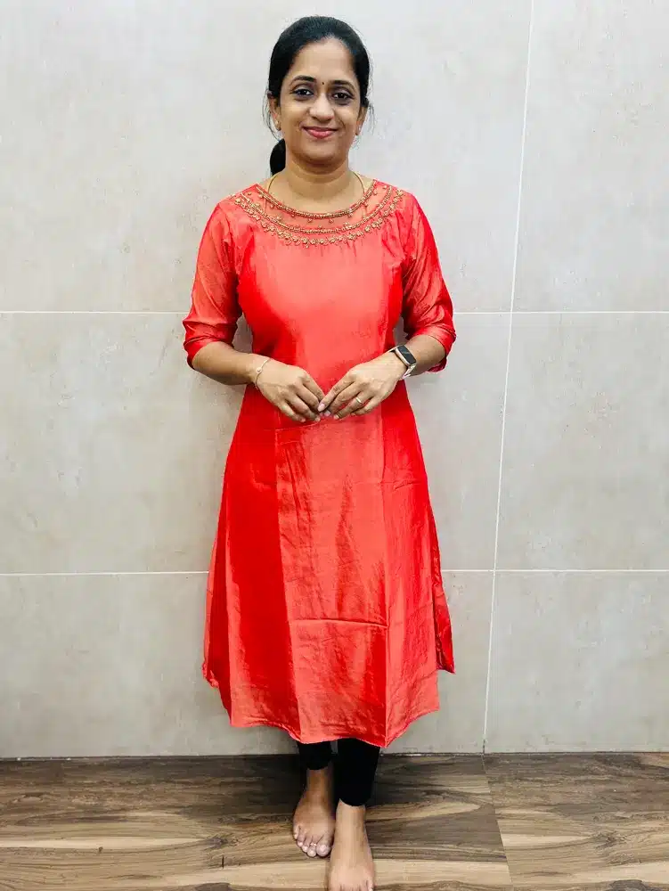 (Metallic peach)Premium soft silk top(crepe lining)with handwork on transparent soft net(Aline pattern)