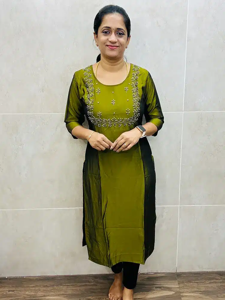 Mehandi green – Premium soft silk top (crepe lining) with pearl and antique bead handwork on yoke (straight cut)