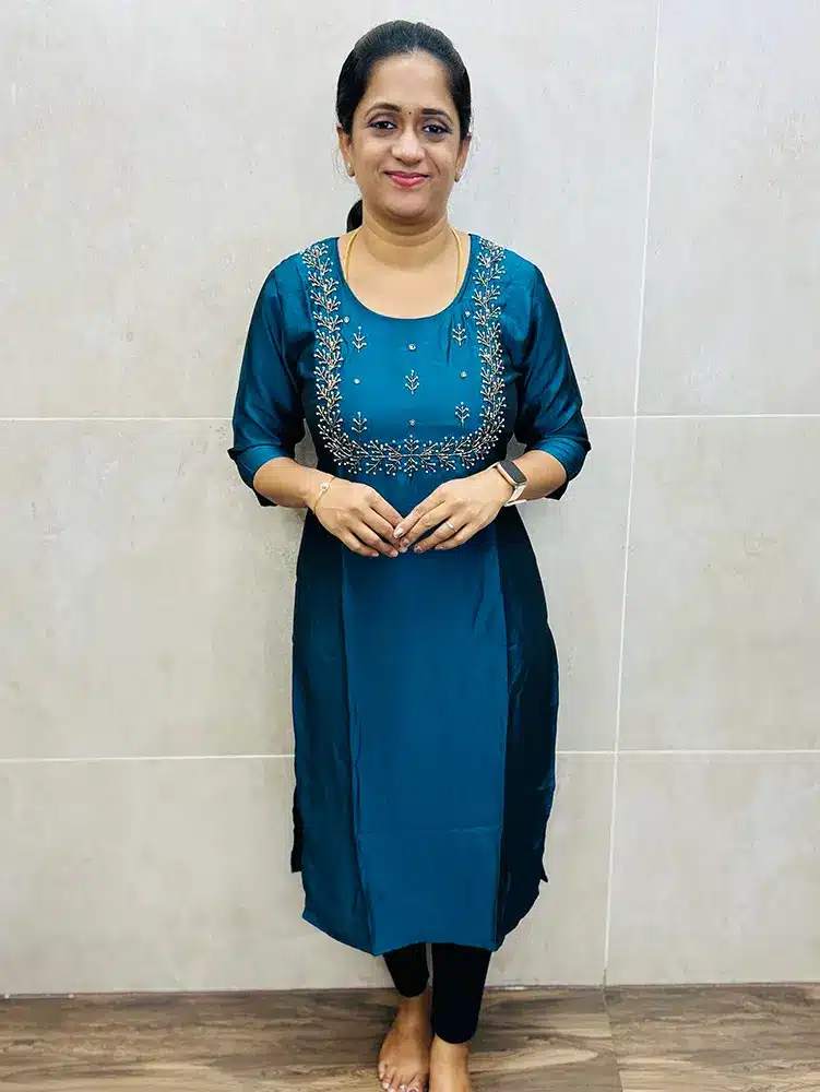 Teal Blue – Premium soft silk top (crepe lining) with pearl and antique bead handwork on yoke (straight cut)