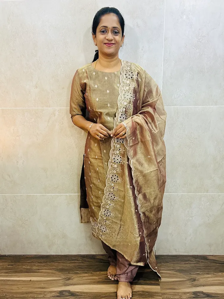 Premium soft tissue silk top (cotton lining) with exclusive cut work on yoke paired with soft tissue silk dupatta and silk bottom (free size)