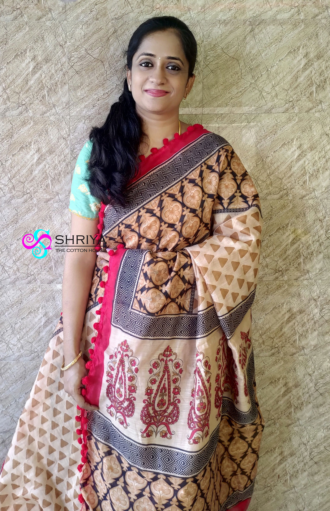 Printed Chanderi silk saree with printed pallu, plain blouse and pom-pom laces