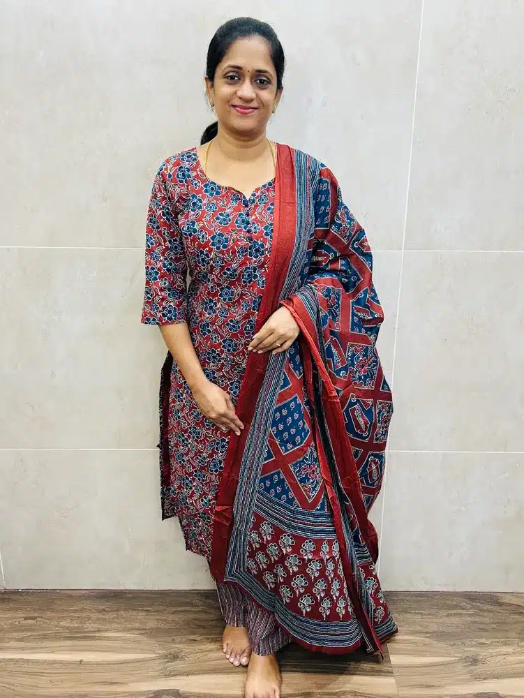 (Red)Printed cotton top(cotton lining)paired with printed cotton dupatta and cotton bottom(straight cut)