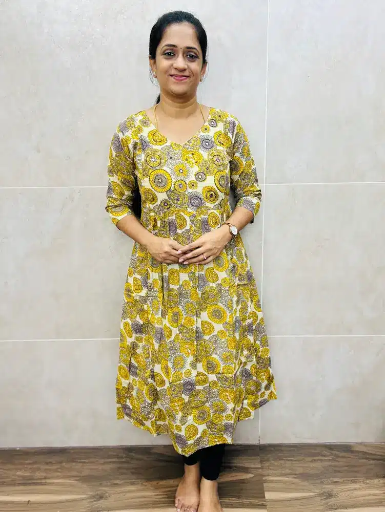 Printed cotton top(cotton lining)with handworked yoke and pleated flare(Aline Gown pattern)
