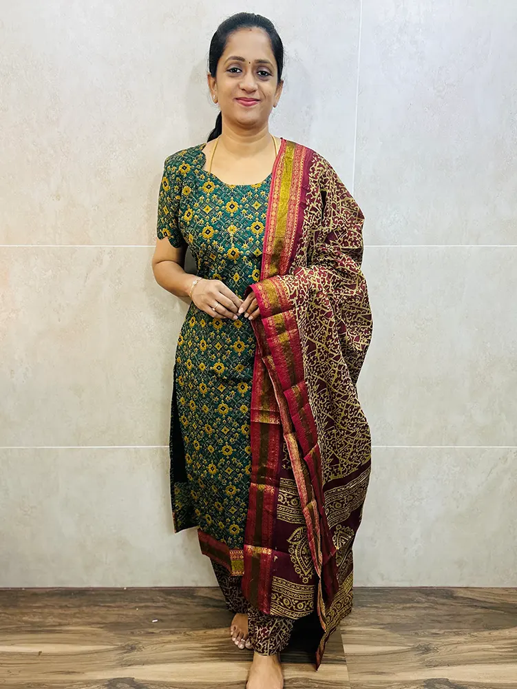 Printed handloom cotton top(cotton lining) paired with printed cotton dupatta and printed cotton bottom(free size)