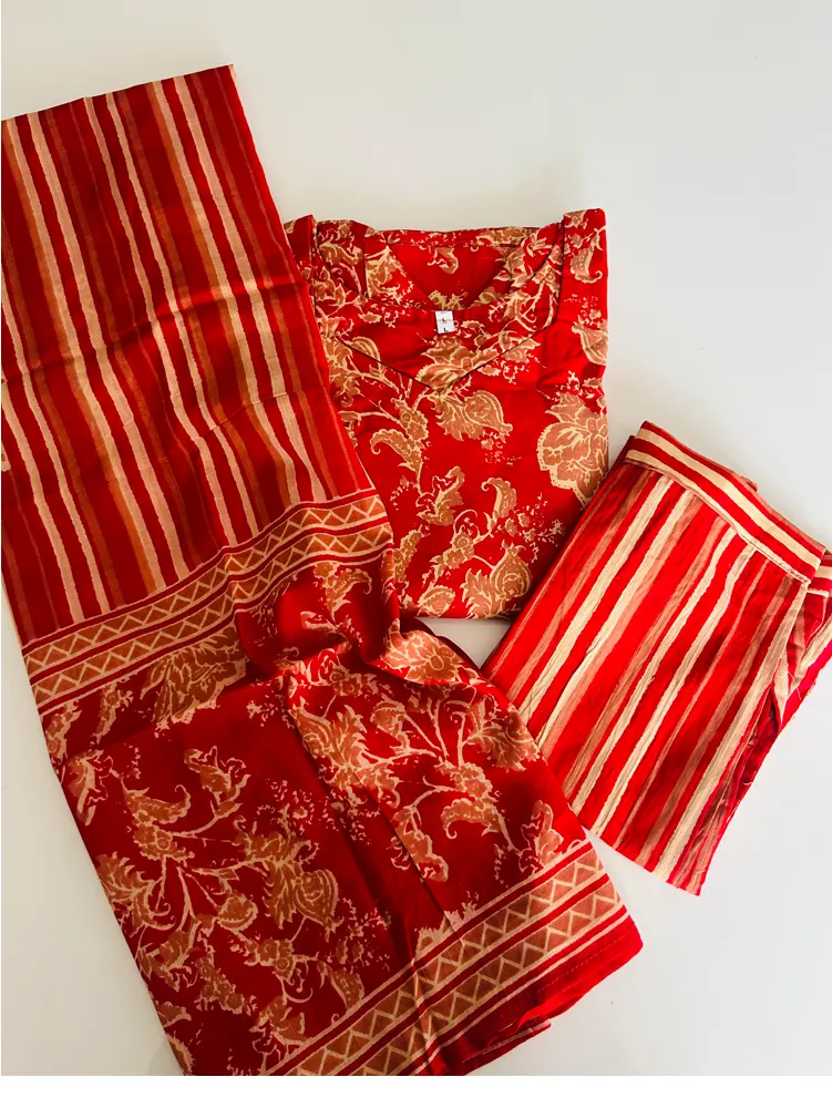 (Red)Printed Jaipur cotton top (cotton lining) paired with printed cotton dupatta and cotton bottom (Free size)