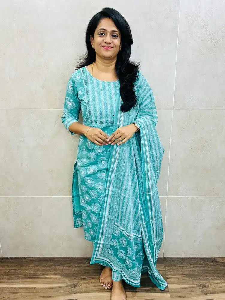 Top and Bottom only – Sea green – Printed Jaipur cotton top (cotton lining) with beautiful handworked yoke and cotton bottom (straight cut)