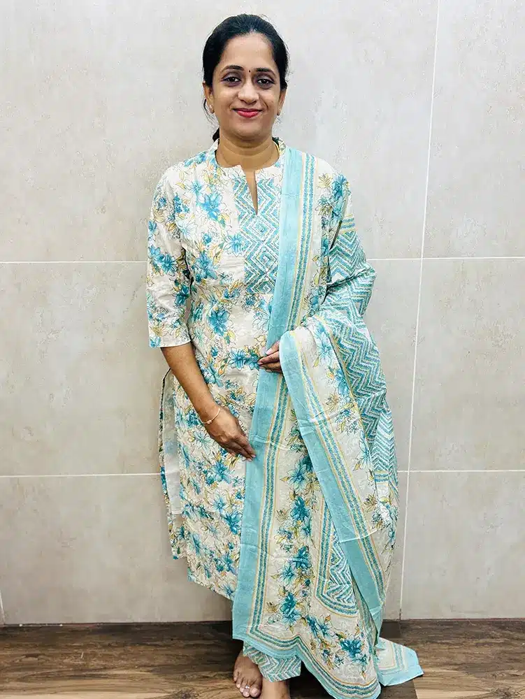 Printed Jaipur cotton top (cotton lining) with potli work on yoke paired with printed cotton dupatta and cotton bottom (straight cut)