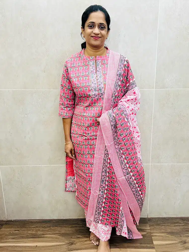 Printed Jaipur cotton top (cotton lining) with potli work on yoke paired with printed cotton dupatta and cotton bottom (straight cut)
