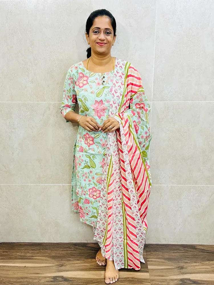 Printed Jaipur cotton top (cotton lining) paired with printed cotton dupatta and cotton bottom (straight cut)