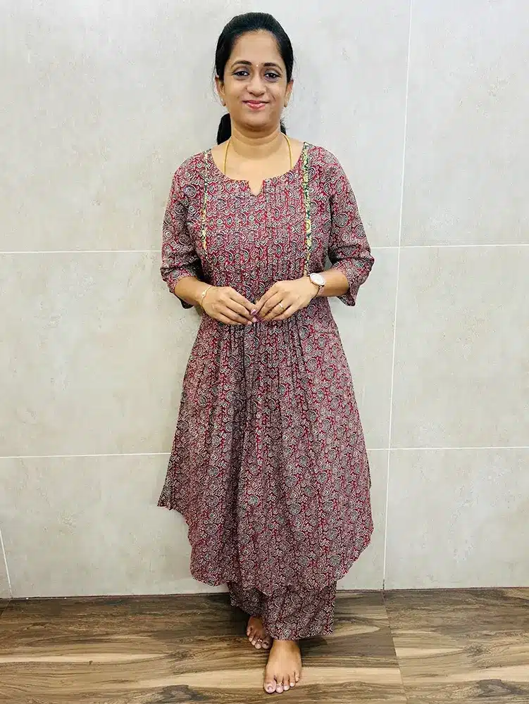 Printed Jaipur cotton top (cotton lining) with pleated work on yoke paired with printed cotton bottom (semi palazzo)