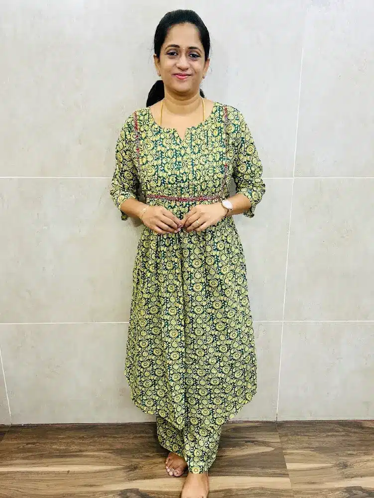 Printed Jaipur cotton top (cotton lining) with pleated work on yoke paired with printed cotton bottom (semi palazzo)