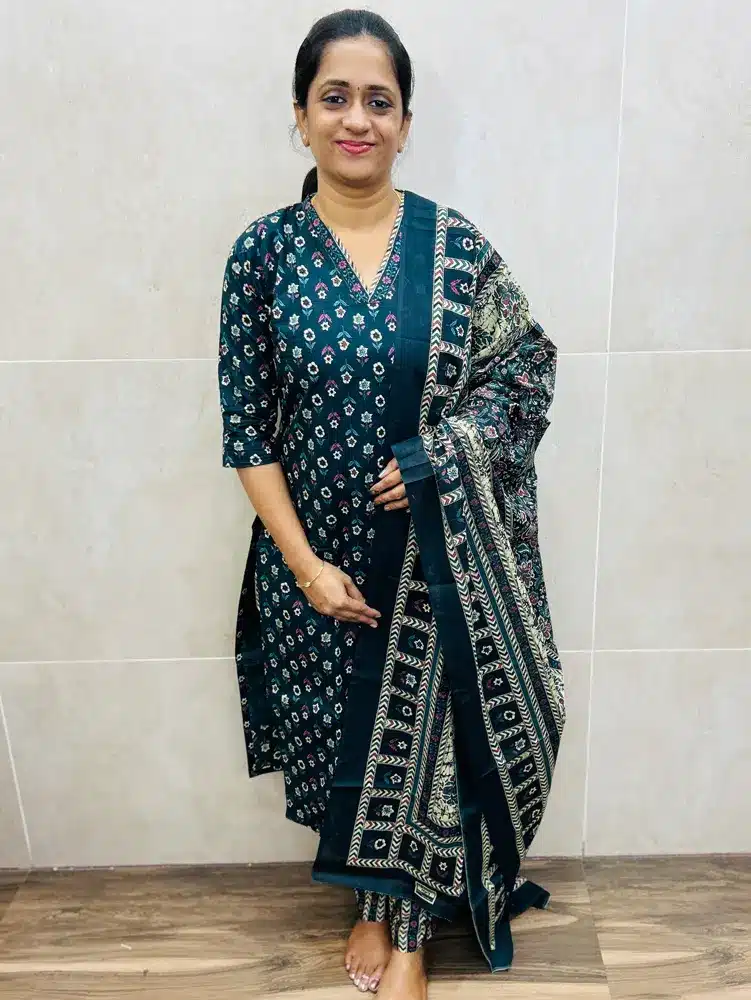 (Dark Green)Handblock printed Jaipur cotton top(cotton lining) paired with printed cotton dupatta and cotton bottom(straight cut)