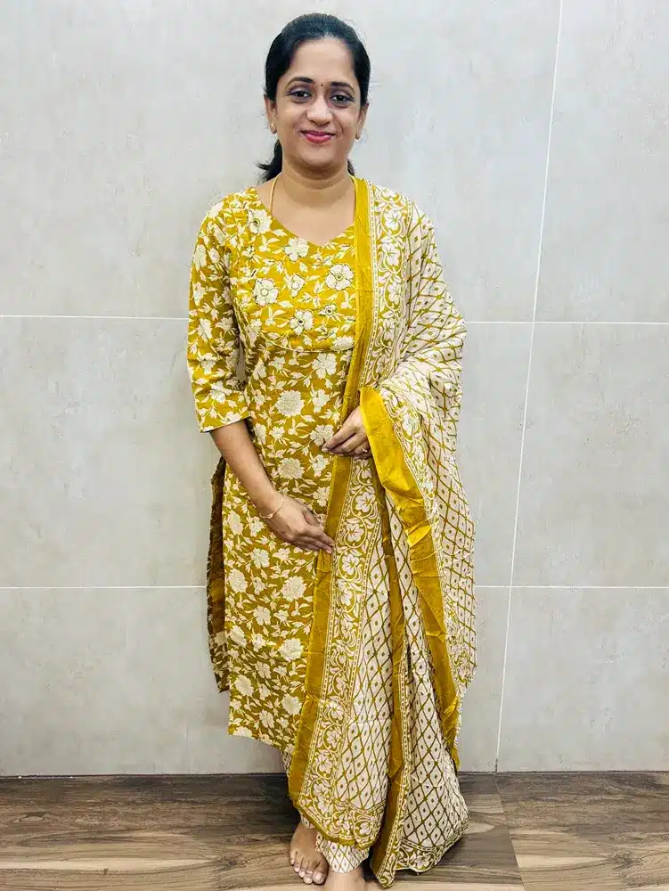 (Mustard yellow)Printed jaipur cotton top(cotton lining) with handworked yoke paired with printed cotton dupatta and cotton bottom(straight cut)