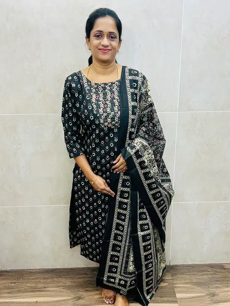 Black – Handblock printed Jaipur cotton top (cotton lining) paired with printed cotton dupatta and cotton bottom (straight cut)