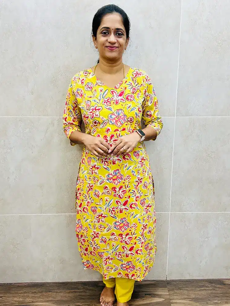 (Yellow)Printed Jaipur cotton top(cotton lining)with handworked yoke paired with printed cotton bottom(straight cut)