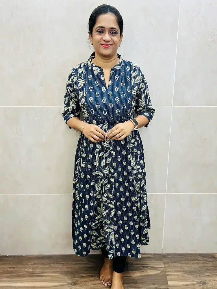 (Dark navy blue)Printed Kantha cotton top (cotton lining) with handworked yoke (Panel cut Anarkali)