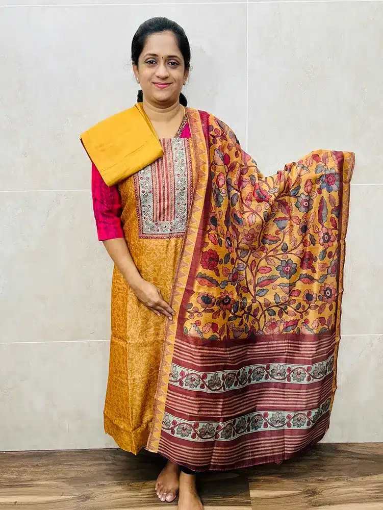 Printed Maheshwari silk top with embroidered yoke paired with printed Maheshwari silk dupatta and cotton silk bottom