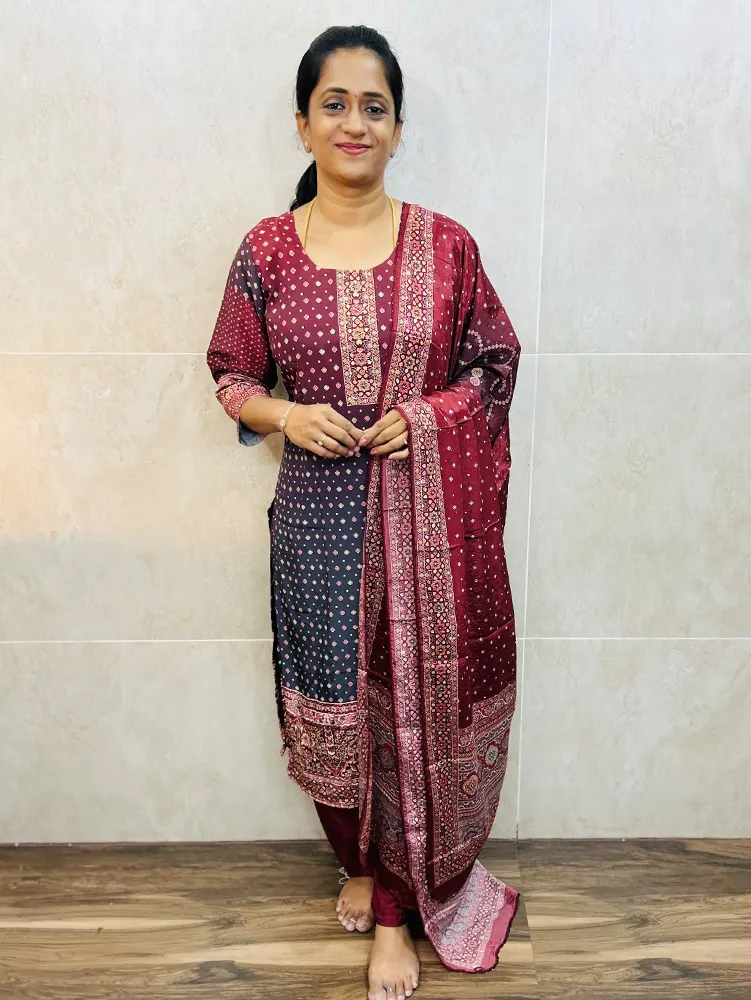 Printed soft musiln silk top (cotton lining) paired with muslin silk dupatta and silk bottom (free size)
