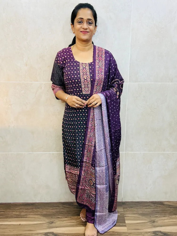 Printed soft musiln silk top (cotton lining) paired with muslin silk dupatta and silk bottom (free size)