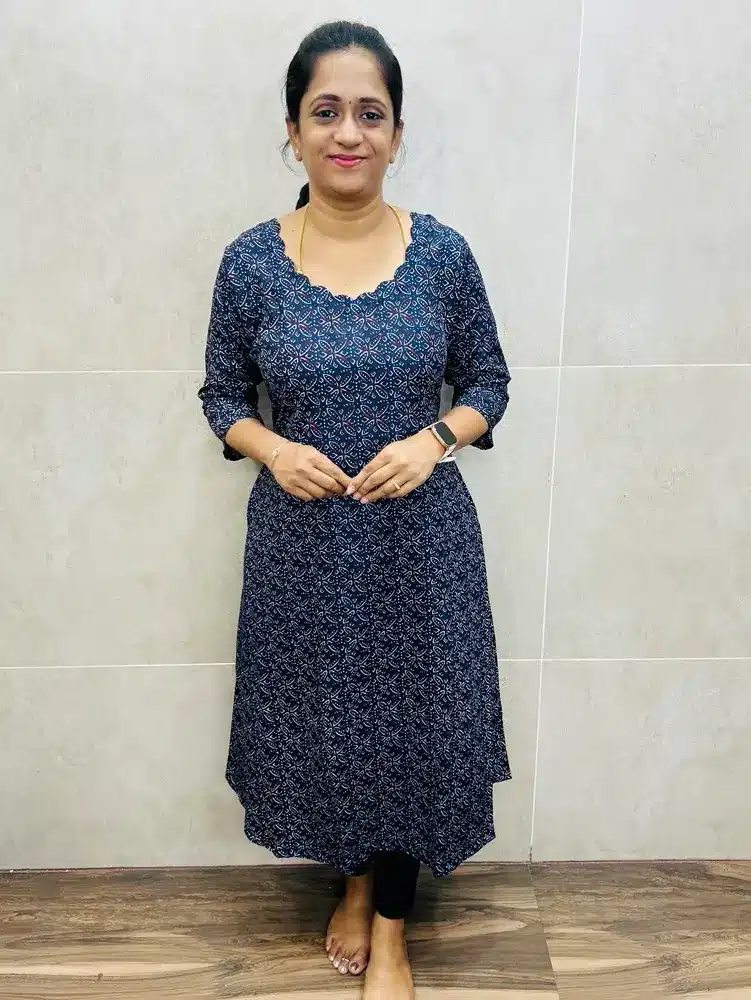 (Pattern1-Blue)Printed soft silk top with scallop neck and 2-side pockets(Aline pattern)