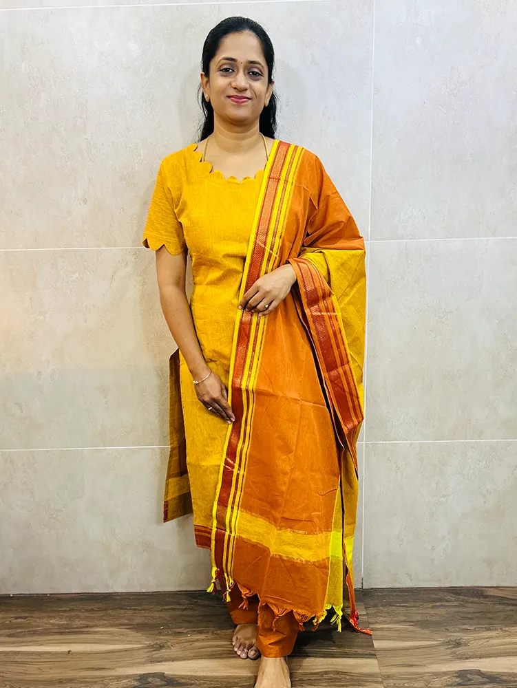 Pure handloom cotton top (cotton lining) paired with cotton dupatta and cotton bottom (free size)